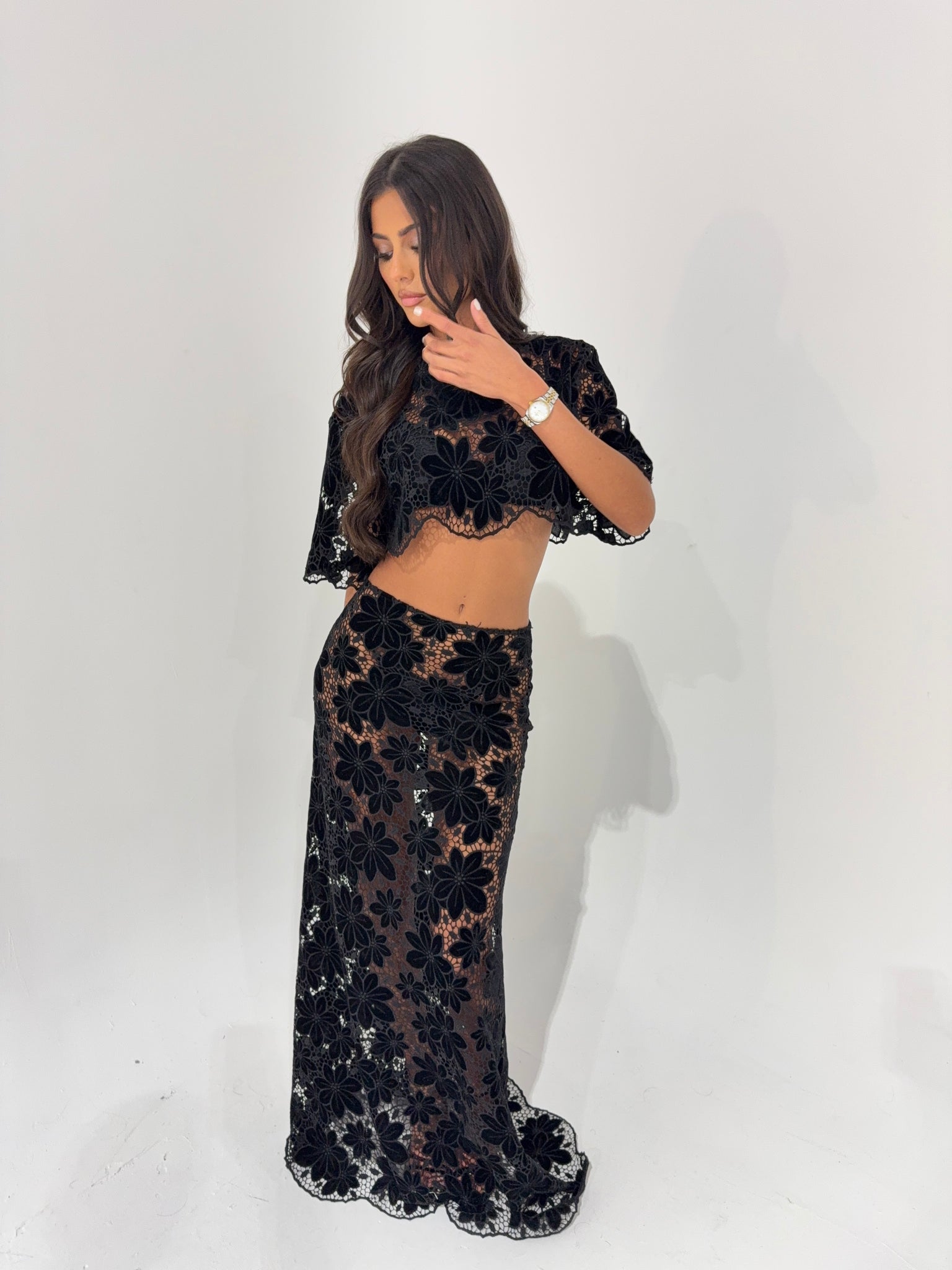 Our stunning maxi skirt, designed in intricate black floral lace that creates a bold yet sophisticated statement.Soft, romantic touch, while the sheer lace reveals subtle hints of skin for a captivating finish.