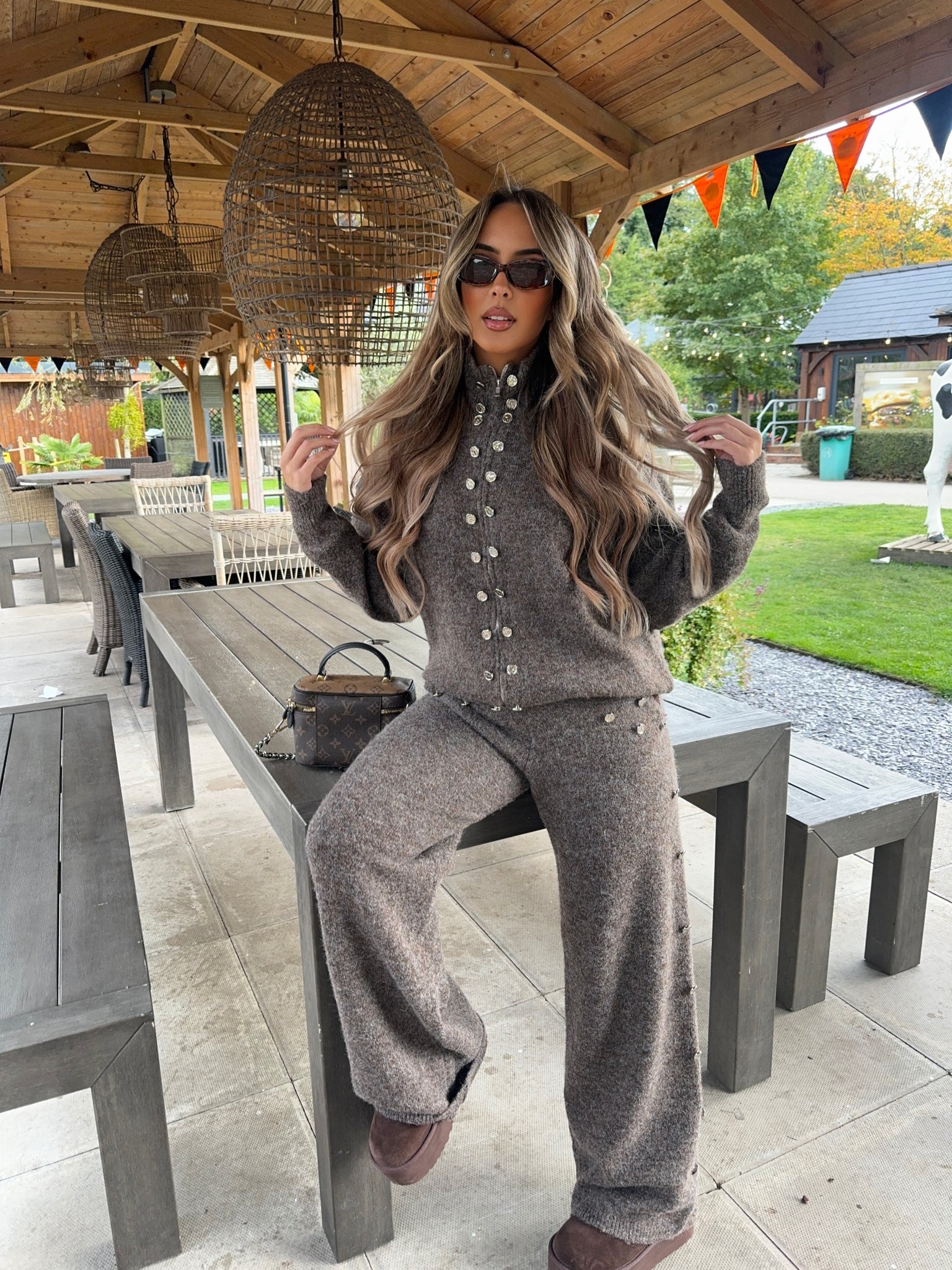 These tailored wool trousers are a refined take on cozy, cold-weather dressing. Made from a luxurious chocolate-toned wool fabric, they offer a slim, flattering silhouette and clean lines. The standout feature is the metal button detailing running along the outer leg seams, adding a modern, utilitarian edge to a classic shape.