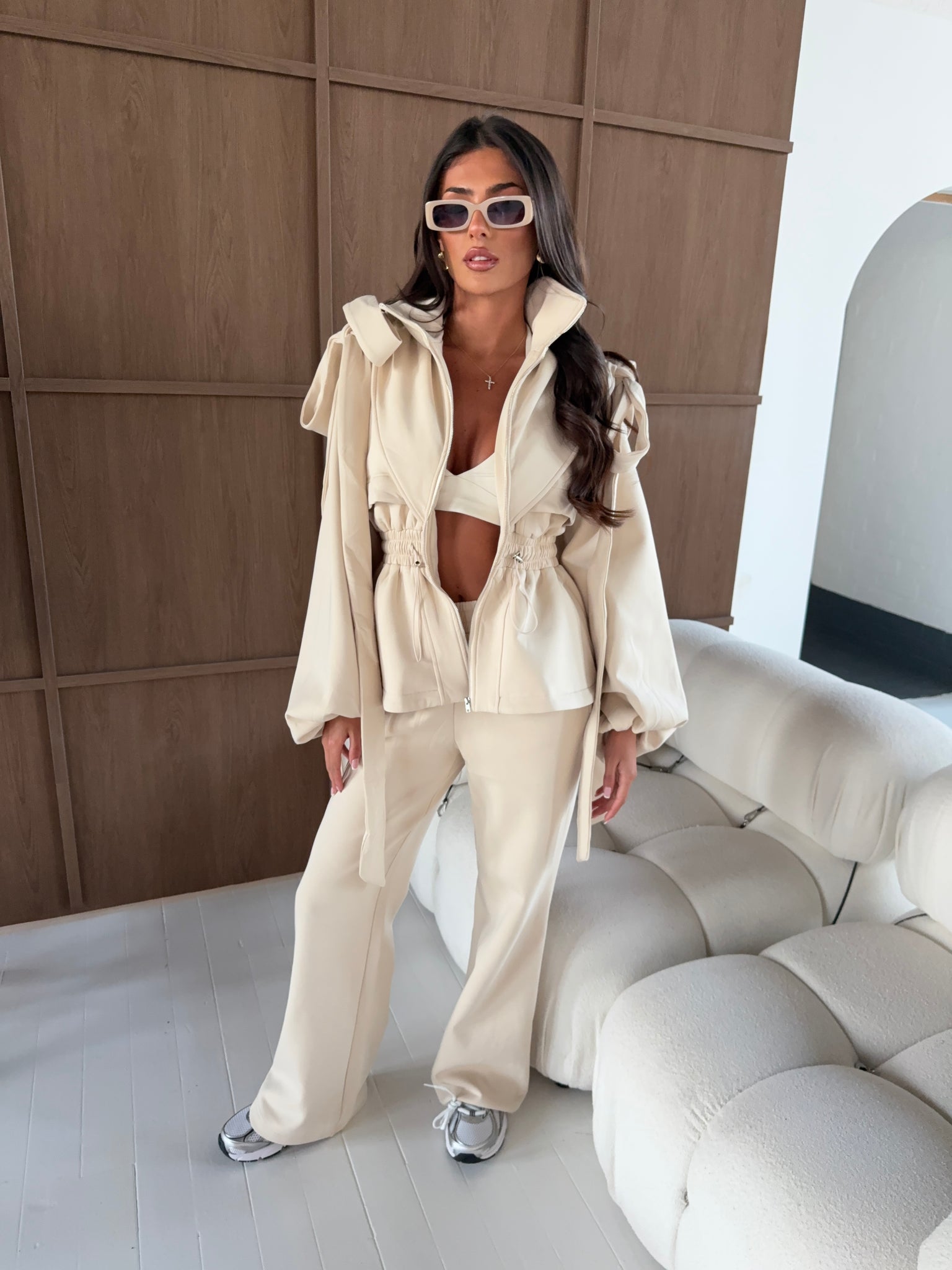 Elevate your wardrobe with this statement-making jacket in cream.